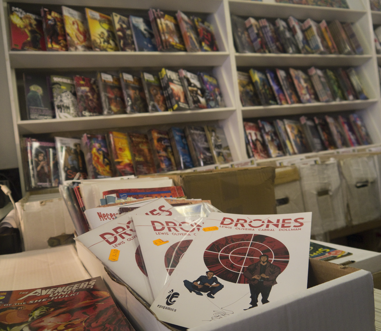 Chris Lewis, writer/creator of Drones, had contacted me and asked if I could collect remaining issues that were currently being sold at Orbital comics in Leicester Sq. Orbital has a healthy turnover of self published titles every 2-3 months (Drones is by far the highest quality comic I have seen in that section in a long time). So after collecting these I thought long and hard about where these issues could continue their happy life, hence my trip to Krypton Komics!
